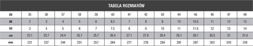 3. Na podstawie tabeli dobierz rozmiar, pamiętając, że jeśli długość Twojej stopy jest na pograniczu dwóch rozmiarów, należy wybrać ten większy.