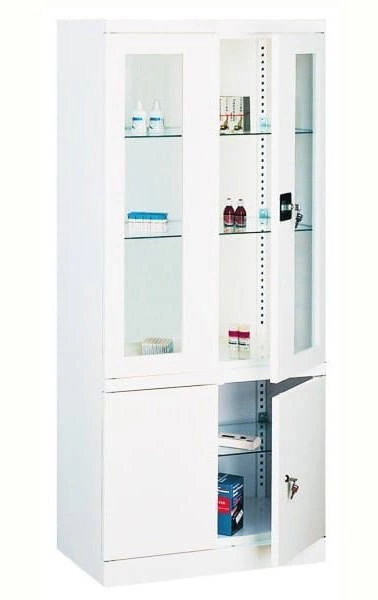Szafa lekarska wykonana z blachy, na przechowywanie medykamentów i innych niezbędnych rzeczy. Model SML 114 posiada dwie szklane półki w górnej części oraz jedną w części dolnej. Półki można przestawiać co 25 mm.