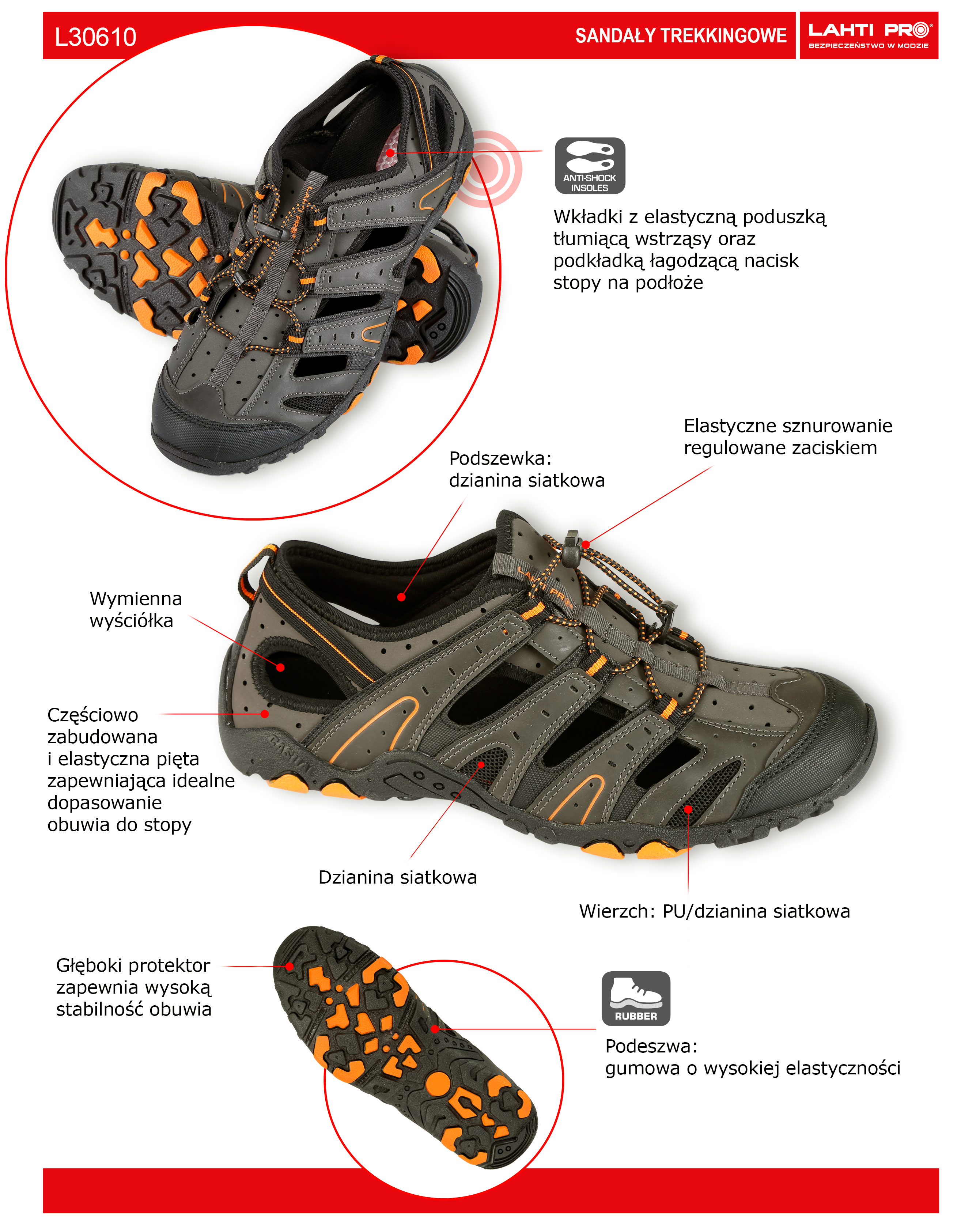 Sandały wykonane zostały z poliuretanu i dzianiny siatkowej. Pięta w tym modelu obuwia została zabudowana tylko częściowo i jest ona elastyczna, dzięki czemu dobrze dopasowuje się do stopy. Wyściółkę można wymieniać. Podeszwa wykonana została z gumy o wysokiej elastyczności. Głęboki protektor podeszwy zapewnia wysoką stabilność obuwia. Wkładki wewnątrz obuwia posiadają elastyczne poduszeczki tłumiące wstrząsy oraz łagodzące nacisk stopy na podłoże. Sznurowadła wykonane z elastycznej gumki, regulowane są plastikowymi zaciskami.